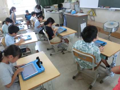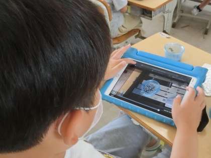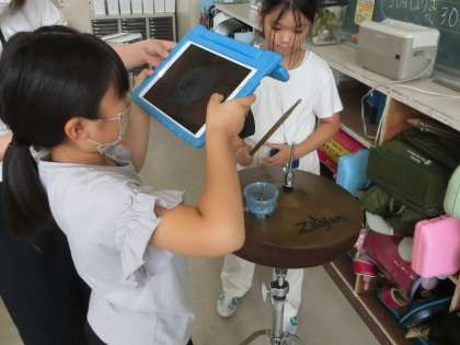 3年生の理科です。音が出ている楽器のふるえ方を、ビーズの動きでとらえました。児童たちは学習用タブレットで撮影した映像を繰り返し見ながら、音の不思議の答えを考えていました。