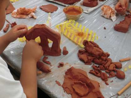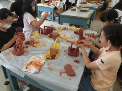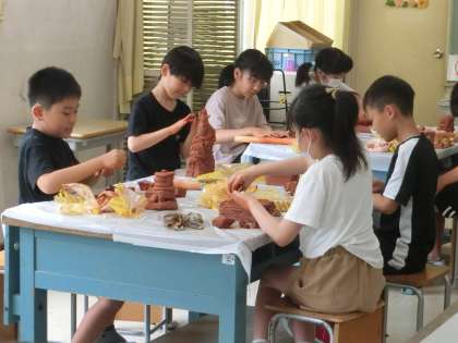 4年生の図工です。粘土とさまざまな道具を使って、立体的な作品を作っています。作品が完成した後はさまざまな角度から作品を鑑賞し、見え方の違いをとらえて造形的な面白さを体感します。