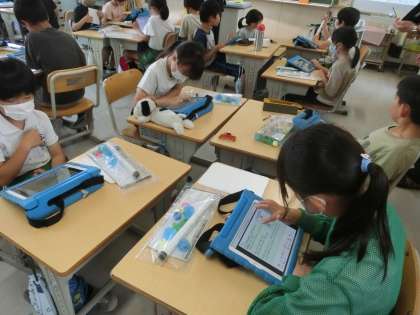 4年生の理科です。とじこめた空気に力を加えると体積や手に感じるようすはどうなるかを考えました。学習用タブレットの発表ノートに予想とその理由を書き、自分の考えをもって授業に参加していました。
