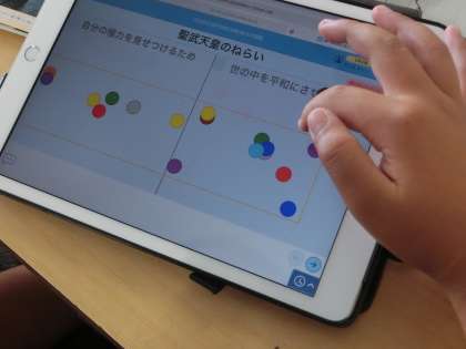 6年生の社会です。大仏を造った理由を考え、意見を出し合いました。意見をまとめると2つの考え方が見えてきました。そこで、学習用タブレットで、自分はどちらの考えに近いかをポジショニングで見える化しました。全員のポジションを共有した画面では、ポジションごとにコメントが表示され(写真下)、席が離れている人とも対話的な活動をすることができます。