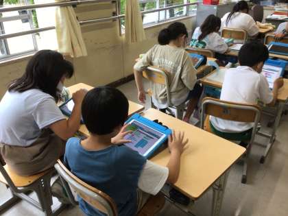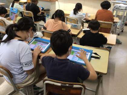 4年生が、学習用タブレットのアプリを使って、プログラミングを考えています。命令文を使って、キャラクターを動かしたり、道具を使えるようにしたりしています。