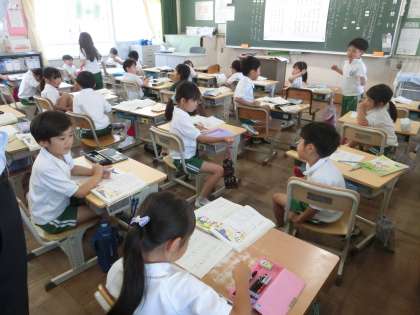 1年生の国語です。「〜の〜、あいうえお」のように、「あ・か・さ・た・な」で始まる詩をつくりました。ペアで相談タイムをとり、どの児童も自分だけの詩を作ろうと頑張っていました。