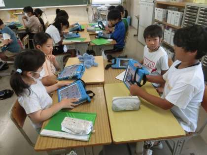 4年生の総合的な学習の時間です。環境問題について調べたことの発表をよりよくするために、グループで話し合っています。プレゼンソフトを使って写真を示したり、表示する言葉を要約したりして、聞き手に伝わりやすいプレゼンになるように意見を出し合いました。