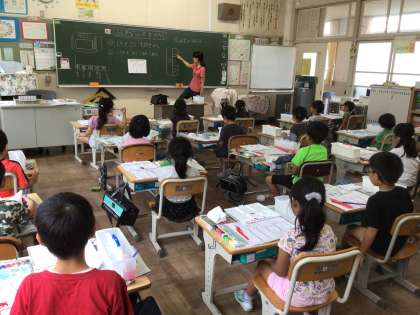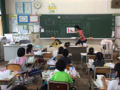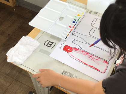 1年生の図工です。絵の具の筆やパレットや水入れの使い方を学び、実際に色をぬりました。色をぬると模様が、浮き出てきました。