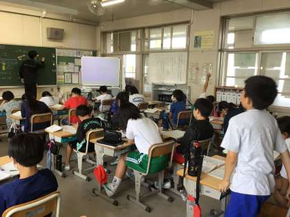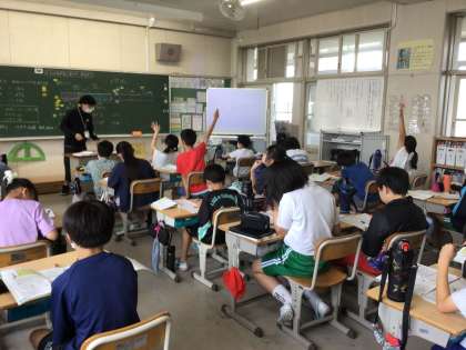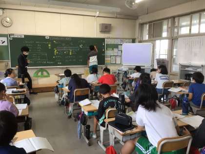 6年生の算数です。文章問題の解き方をを帯グラフを使って考えています。帯グラフのどの部分の数字から求めていくと良いかを考え、意見を出し合いました。