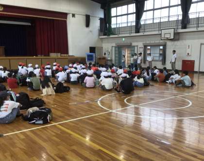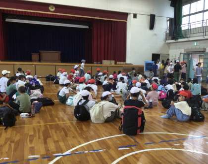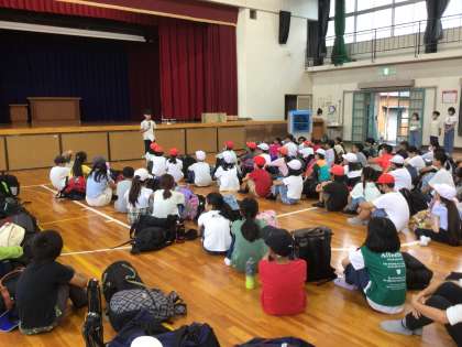 出発式です。健康観察をした後、係の児童が会を進行しました。「2日間で、協力してみんなの良いところを見つけましょう」という言葉も聞かれました。全員でスローガンを唱和して、気持ちを高めて出発します。