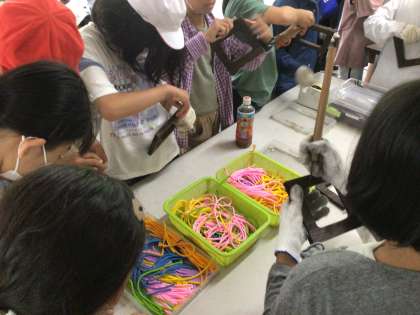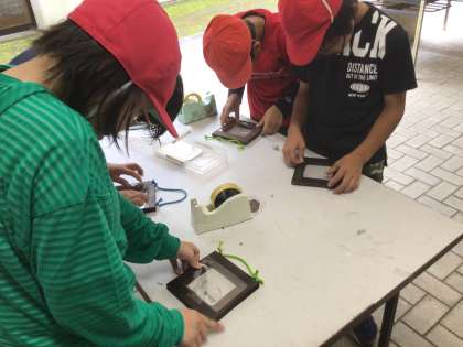好きな色のひもをつけて、フレームにフィルムを貼ったら、絵を描いていきます。