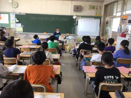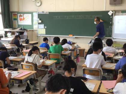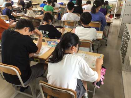 6年生の英語です。「k]「p]「q」「r」「s」「t」「u」のアルファベットが入った英単語を聞き取る学習です。デジタル教科書から出題される問題を集中して聞き取り、答えを記入しています。ヒアリングの能力を高める授業です。