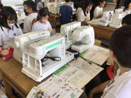 5年生の家庭科です。初めてミシンを使う授業を行います。手縫いと比べてミシン縫いのよさを考えるところから、授業が始まっています。
