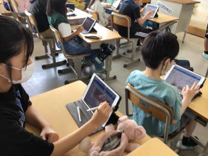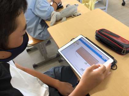 6年生の算数です。学習用タブレットに配布された円の面積を求める課題を考えています。円を細かく分割して考え、公式までたどりつくように配布した課題が工夫されていました。
