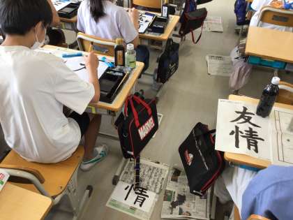 6年生の書写です。「友情」という文字の筆順と点画のつながりを意識して、字形を整えて書くことが目標です。「情」の「りっしんべん」の筆順と点画のつながりを確かめながら、書いています。