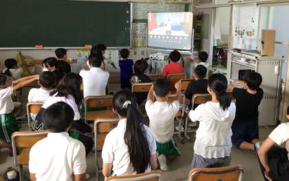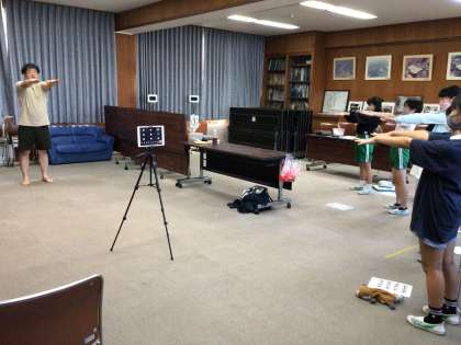 カイロプラクターの方を講師にお招きし、3時間目に全校で保険集会を行いました。会議室と教室をオンラインでつなぎ、アンケート調査をした保健委員会の報告を聞いて姿勢について考えたり、講師の先生に教えていただいた姿勢エクササイズを実際にやってみたりしました。