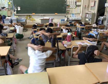 保健委員会による朝の姿勢エクササイズタイムが始まりました。写真は、体幹の筋力を鍛えるエクササイズです。両手を頭の後ろに組んだまま、深く右左に屈伸しています。