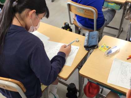 6年生の国語です。俳句をつくるために、一つの言葉からイメージされるものを題材として集め、言葉のつながりを考えていきます。学習用タブレットを使って調べながら、題材集めをしている児童もいました。