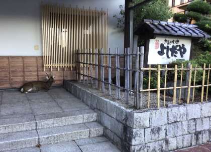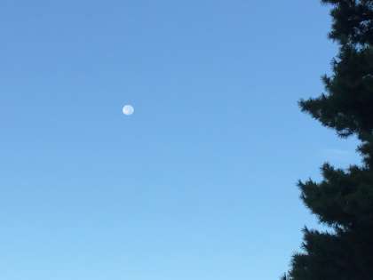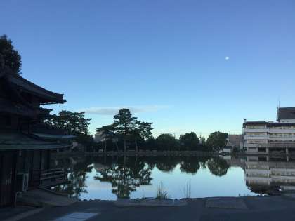 おはようございます。修学旅行2日目の朝です。宿の前には、早起きの鹿がたたずんでいます。猿沢池を眺めると白いお月さまが顔を見せていました。児童たちも間もなく起床です。