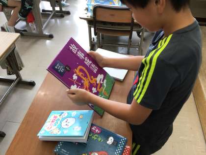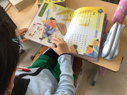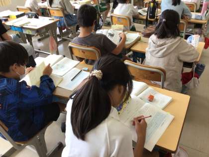 4年生の国語です。「転ばぬ先の杖」「矛盾」などの言葉が使えるように、意味を調べています。辞書で調べたり、図書室で借りてきた本で調べたりしています。