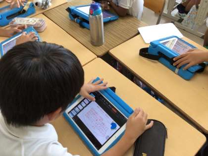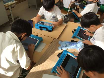 4年生は、総合的な学習の時間に環境問題について探究しています。そのときの参考にするために、図書室からSDGsに関連する本を集めて利用できるようにしています。児童たちは、探究したことを学習用タブレットの発表ノートにまとめています。