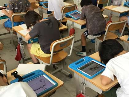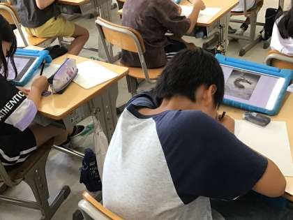 しています。学習用タブレットで調べて、自分のイメージを膨らませ、下絵を描いていました。