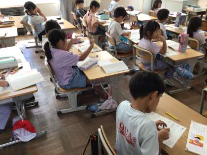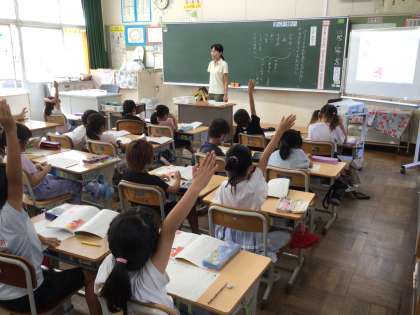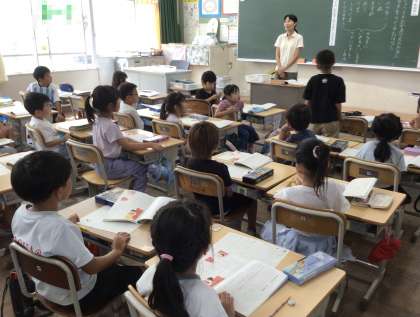 1年生の国語です。病気のお母さんのために、りっちゃんがどんないいことを考えたのかを読み取る学習です。サラダを作る場面では、野菜を切ったり、大きなお皿にもりつけたりするようすを動作を交えながら読み取っていきました。(写真下)