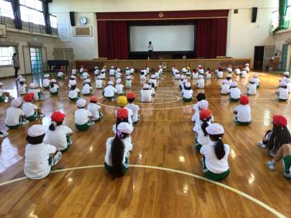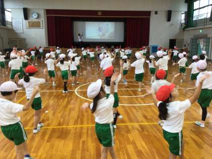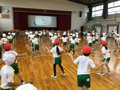 2年生の運動会のダンスの練習です。始めに練習のポイントを聞いてから、練習が始まりました。姿勢を正して先生の話を聞いている姿からも、頑張ろうという気持ちが伝わってきました。