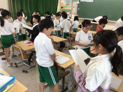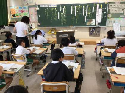 3年生の国語です。「サーカスのライオン」の単元で、読み取りの学習をしています。最初に、登場人物の様子や気持ちが分かるところをペア学習で確認し合いました。全員での発表では、いろいろな場面での気持ちを考えることができ、主人公の気持ちの変化を読み取りました。