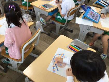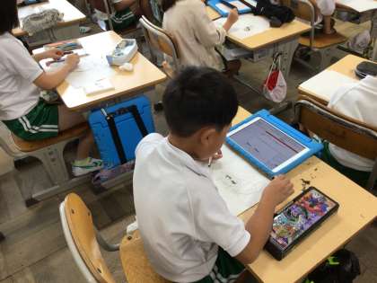 2年生の図工です。読書感想画に取り組んでいます。自分の描きたい場面を決め、表情や動きなどの表現するポイントを考えながら下絵を描き進めています。