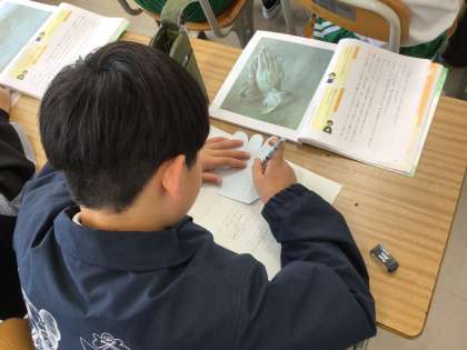4年生の道徳です。友情と信頼をテーマにした物語をもとに、友達との関係を考えました。物語に出てきた友情の象徴となっている「手」の形に紙に、物語を通して考えた信頼し合える友達についての自分の意見を書き、発表し合いました。