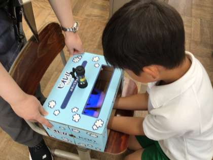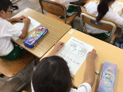1年生の学級活動です。手洗いによって健康が保たれることを知り、正しい手洗いの6つの過程を学びました。どこが汚れているか、どこを洗えばよいかを考え、実際に正しい手洗いをやってみました。手洗い後に、汚れがどれくらいとれたかを確認しました。(写真下)
