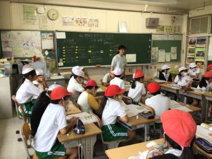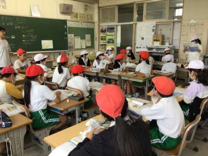 5年生の道徳です。「折れたタワー」という物語から、広い心について意見交流をしています。赤白帽子を使って、2つの考え方について自分の意見がどちらに近いかを色で表しています。意見が追加されると、帽子の色を変えている児童もいて、多様な意見に考えが変容していく様子が分かります。
