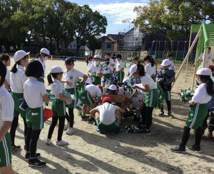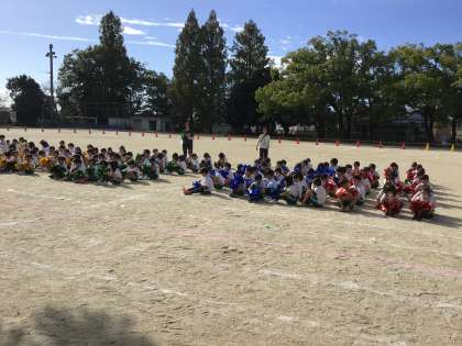 3・4年生の運動会の練習です。小道具を使ったダンスの練習や徒競走の練習を行いました。