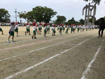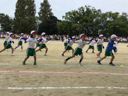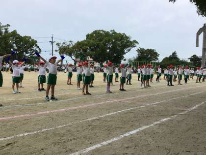 竹村Swallows(スワローズ)です。子ツバメになりきった1・2年生が、かわいらしく、かっこよくリズムに乗って踊りました。