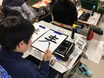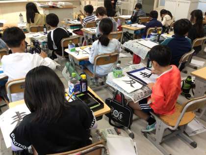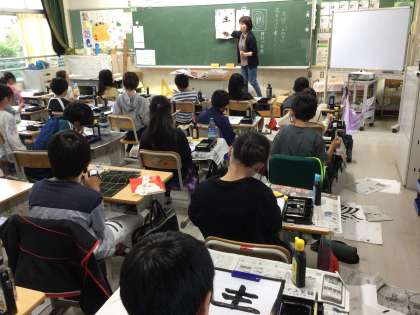 4年生の書写です。文字のバランスをとるために、一画ずつポイントを確認しながら練習しています。児童たちが書いている文字は、「麦」です。