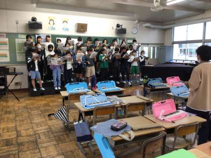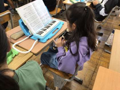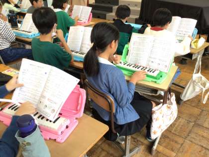 5年生の音楽です。合唱や合奏を学んでいます。合唱では、「和音の移り変わりを感じ取りながら」、合奏では鍵盤ハーモニカとリコーダーで「楽器同士で会話しているみたいに」を目標に練習をしています。