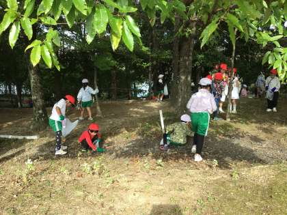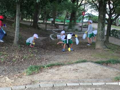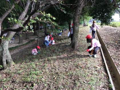1年生の生活科です。校外学習で公園に出かけ、ドングリを拾ったり、自然に親しんだりする活動を行いました。