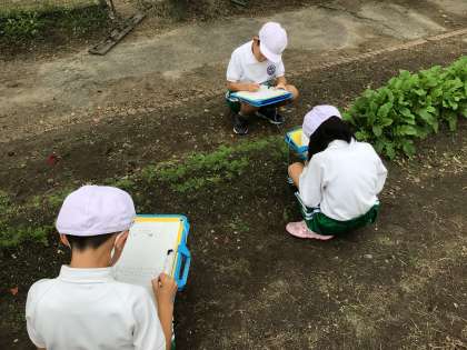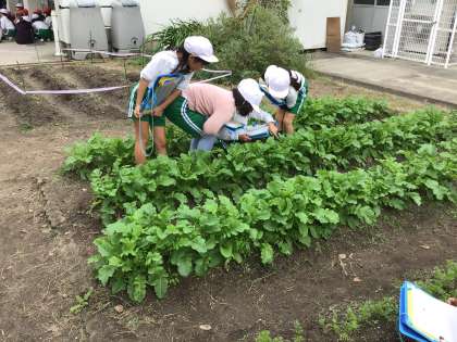 3年生が、冬野菜の成長記録をかいています。葉をよく見ていると、虫の卵を発見しました。