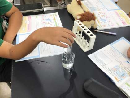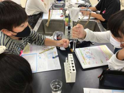 6年生の理科です。炭酸水に溶けているものを調べる実験をしています。振ったときの変化を見たり、石灰水に入れてみたりして、それぞれの班の結果を発表し合い、石灰水に何が溶けているのかを考察しました。