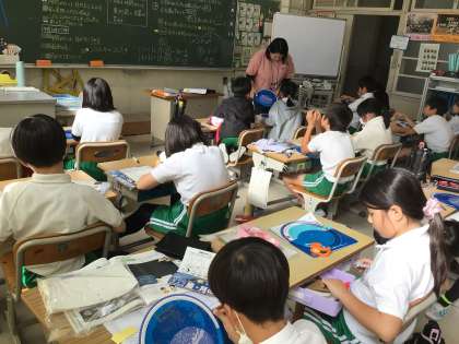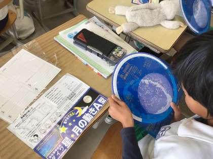 4年生の理科です。月や星の動きの学習で、星座早見盤を使います。今日11日(月)は19時ごろ月の近くに土星が見えます。また、この時期はおうし座流星群が見られます。星座早見盤をとおして、天体や天文学への興味・関心が深まります。