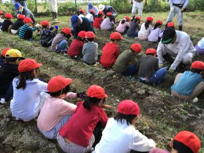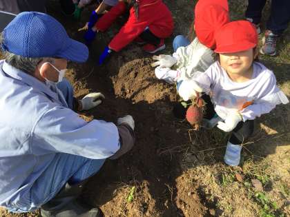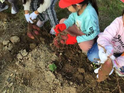 1年生が、竹ボラさんとサツマイモを掘りました。初夏に植えた苗から育ったサツマイモを児童たちは夢中で探していました。