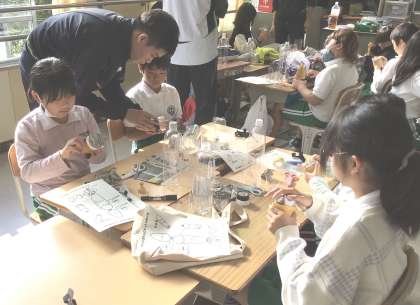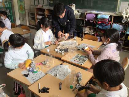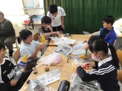 4年生が、豊田工科高等学校の生徒のみなさんとペットボトルロケットを作りました。よく飛ぶロケットの作り方のコツや作り方の難しい部分なども丁寧に教えていただきました。