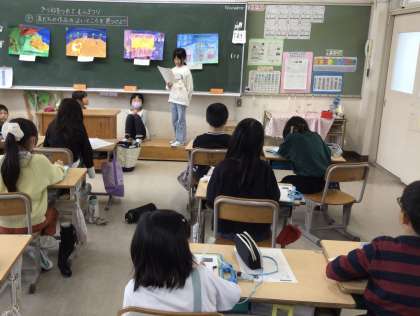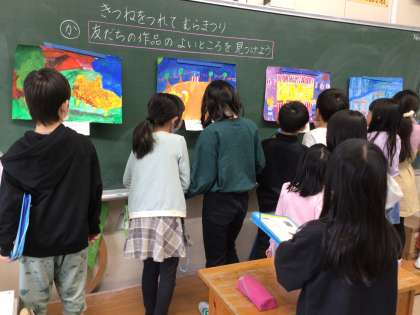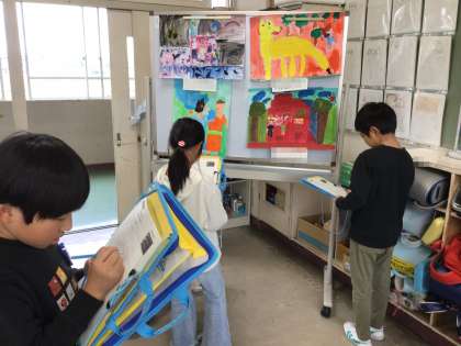 3年生の図工です。読書感想画の発表と鑑賞を行っています。作品を説明を聞いたり、他の作品を鑑賞したりしました。児童たちは、いろいろな作品の良いところを見つけ、次の作品作りに生かしていきます。
