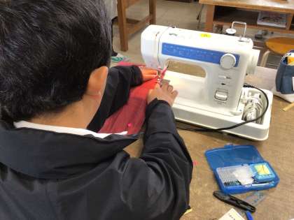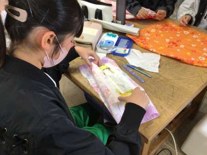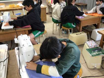 6年生の家庭科です。今までの製作で学んだことを生かして、生活で使える布製品を作っています。各自で何を作るのかを決め、手縫いやミシン縫いなど、今までに学んだ裁縫の技法を使って作品を作り上げていきます。手作り作品のよさを味わうとともに、どんな作品をどのように作るのかを考えることで、児童の発想力も育まれます。