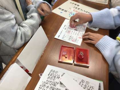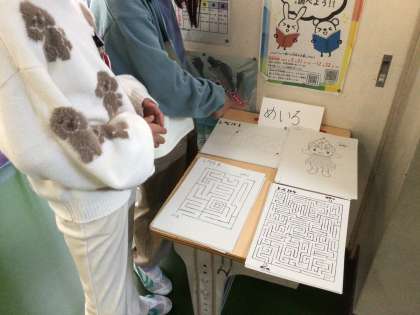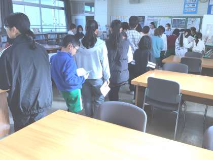 図書委員会の企画で、図書館まつりが開催されています。本を借りる児童の長い列ができており、盛り上がっています。ビンゴカードや迷路を用意し、多くの児童に図書館に足を運んでもらえるように工夫しています。
