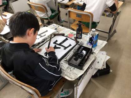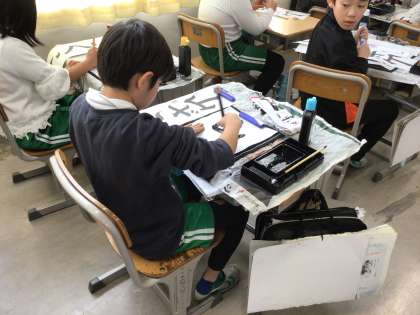 3年生の書写です。書き初めの課題「山ざくら」の練習に入りました。3年生からは、書き初めが毛筆になります。