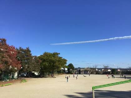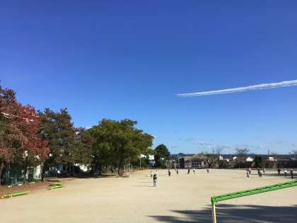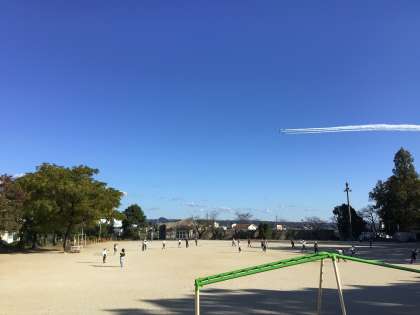 5時間目の体育の授業を運動場で見ていたら、ゴーッという音が聞こえ、上空に飛行機が並んで飛んできました。豊田市で開催されるラリージャパンの展示飛行に向かうブルーインパルスでした。運動場の児童たちも歓声を上げて、空を見上げていました。