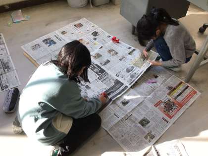 4年生の算数です。1平方メートルの広さを実感するために、実際に新聞紙で1平方メートルを作っています。「百聞は一見にしかず」ですね。