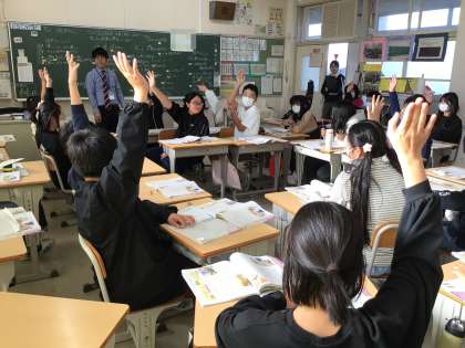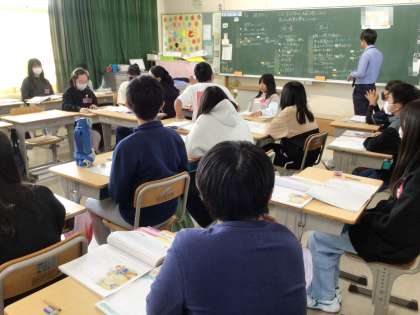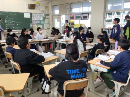 机をロの字形にし、スパイダー討論という形式を用いて、級友の意見を聞きながら各自の考えを深めていきました。