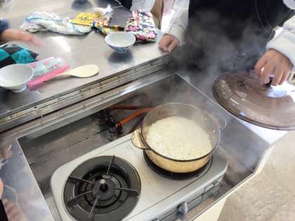 5年生の家庭科です。ガスでご飯を炊きました。耐熱ガラスの鍋で、炊ける様子を観察しました。炊きあがったごはんは、おいしそうな香りがしました。火を使ってご飯を炊くこつがわかったので、炊飯器が使えないときやキャンプなどでもご飯が食べられますね。