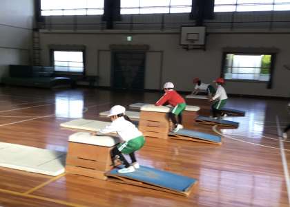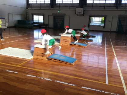 1年生の体育です。跳び箱を練習しています。自分が飛べる高さを選んで練習しています。うまく飛べるように踏み切りの位置や、手をつく位置、手をついた後の体の動きを考えて練習しています。
