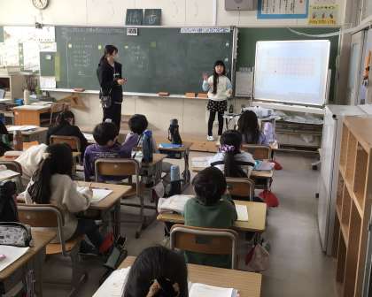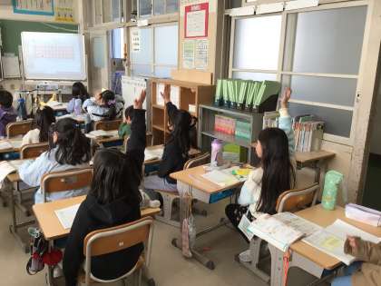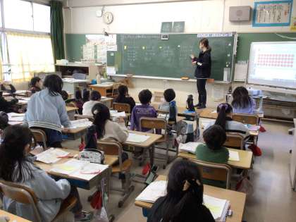 2年生の算数です。12×4の答えの出し方を考えています。図を使ったり、九九の規則性を使ったりして、4つの方法を児童たちが考え出しました。かけ算のひっ算につながる考え方もありました。