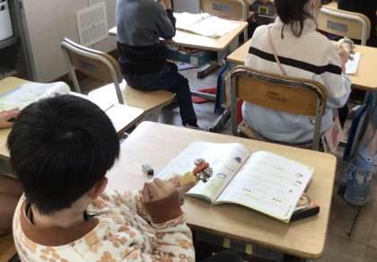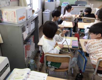 1年生の音楽です。音楽に合わせて、タンバリン、トライアングル、ベルを交代で演奏しました。歌を歌う児童の歌声に合わせて、タイミングよく音を鳴らして、楽しく合奏ができました。